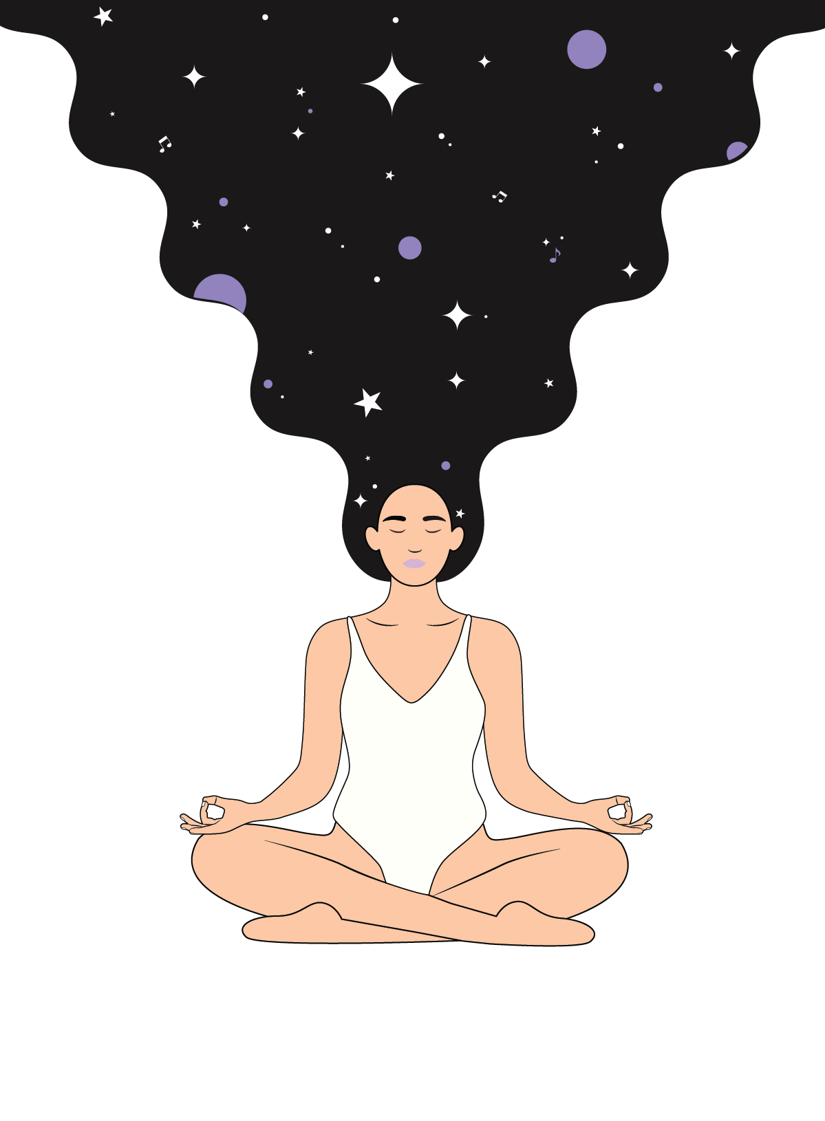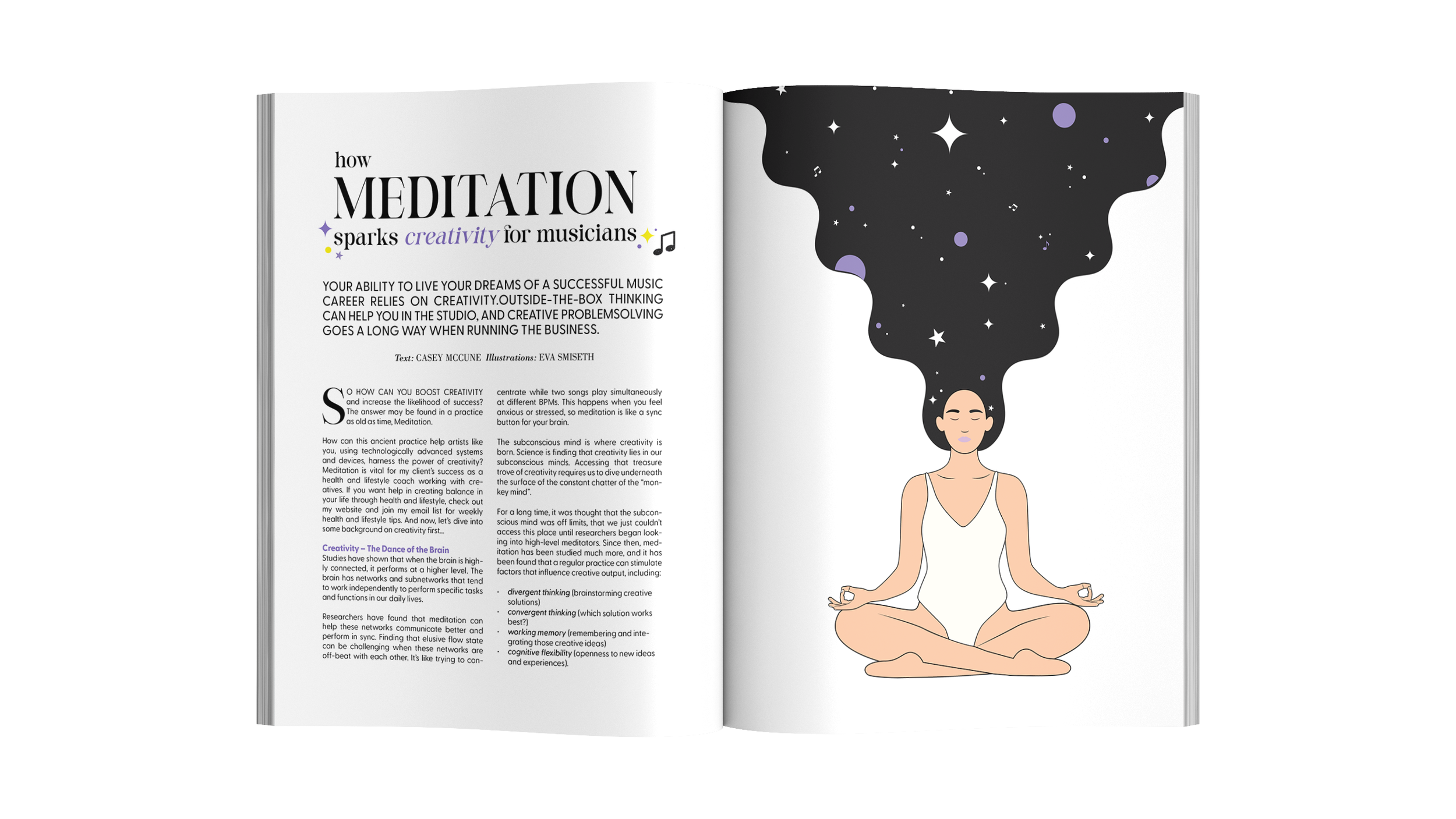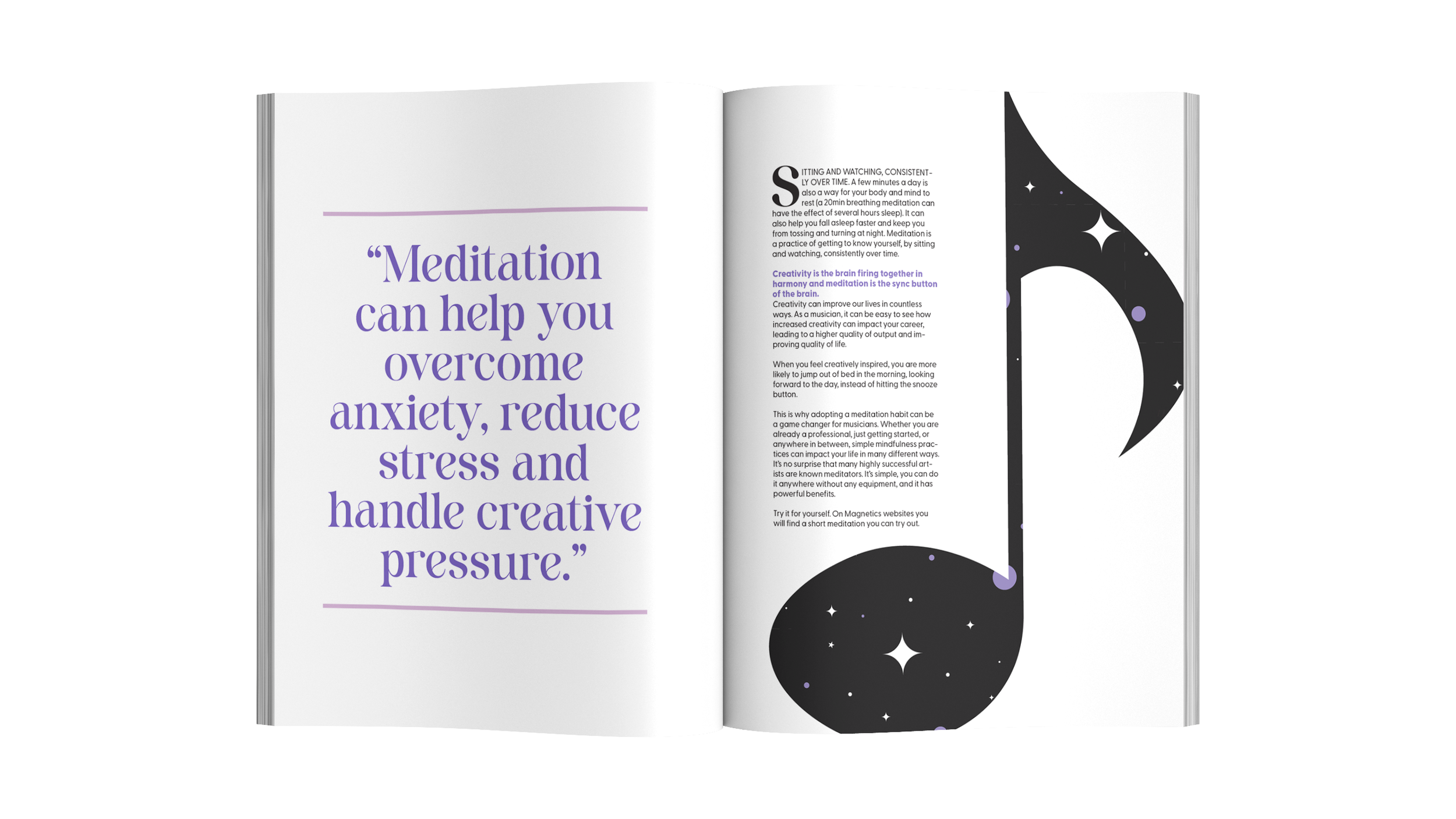 Magazine layout and illustrations for the article "How Meditation Sparks Creativity for Musicians". The illustrations combine musical elements with a dreamy, cosmic universe – where the night sky becomes a visual metaphor for the inner, meditative space. The layout balances large typographic quotes, editorial illustrations, and body text.